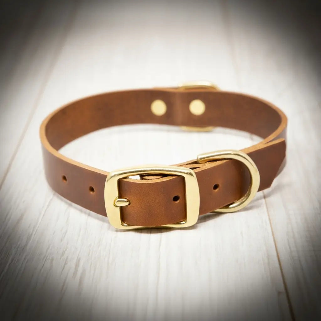- .75 - 1.25” width strap fits through the brass hardware to provide a sturdy closure that will securely stay on your dog.